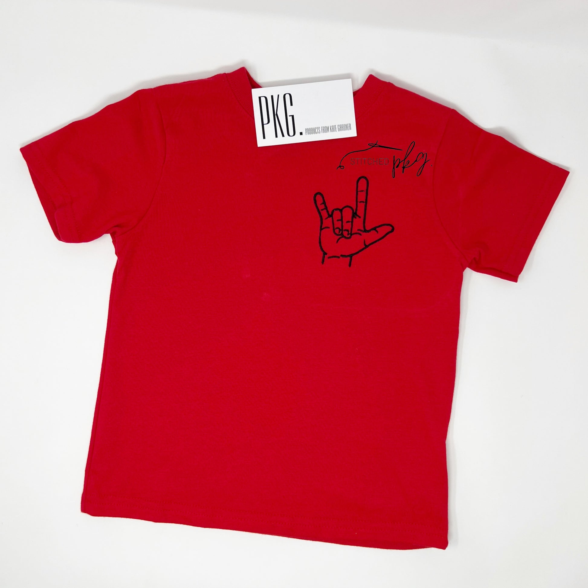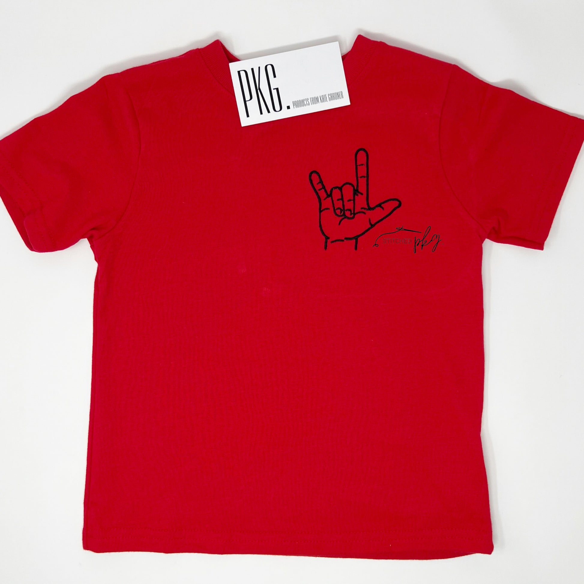 ASL I Love You Hand Signal embroidered on the Left Side Chest.