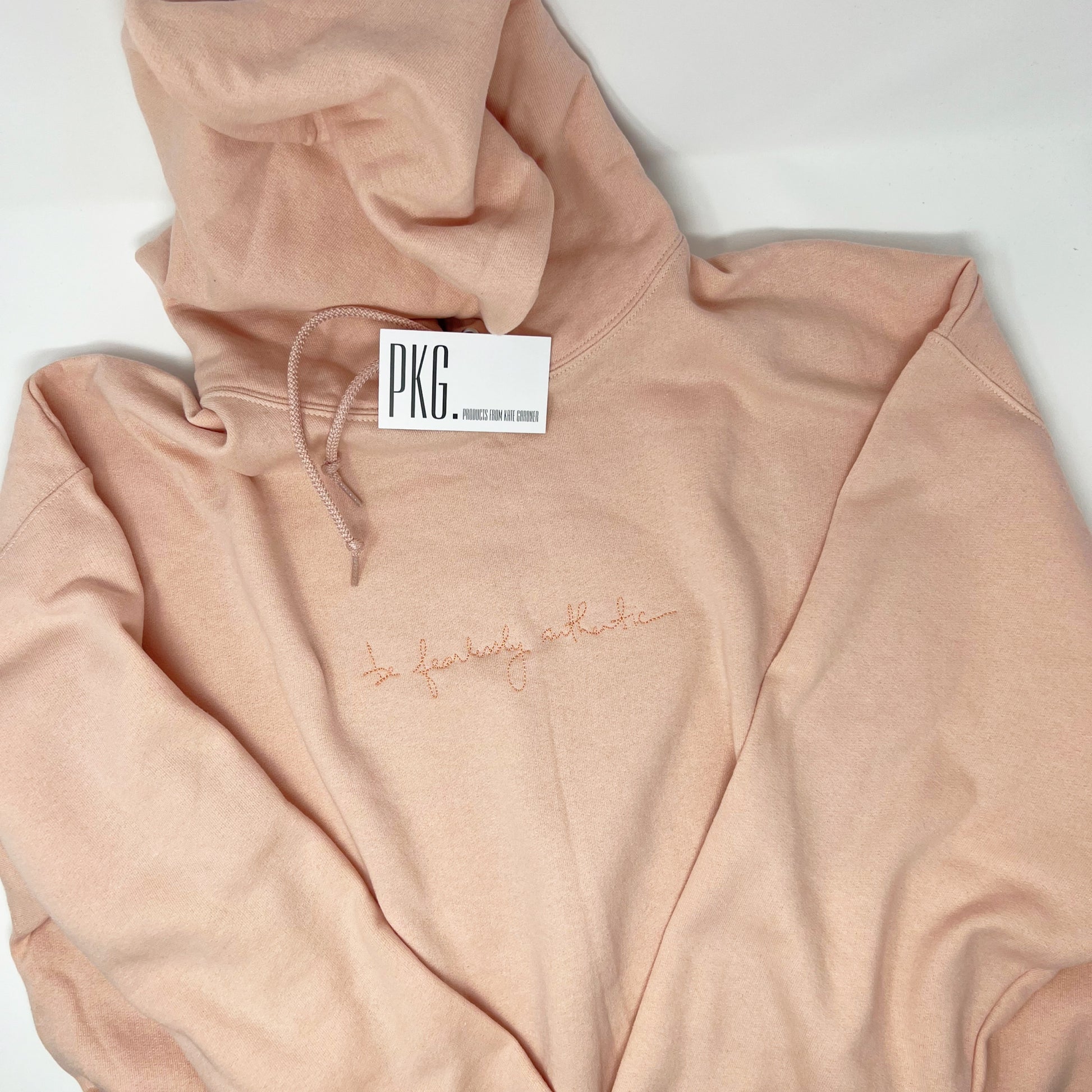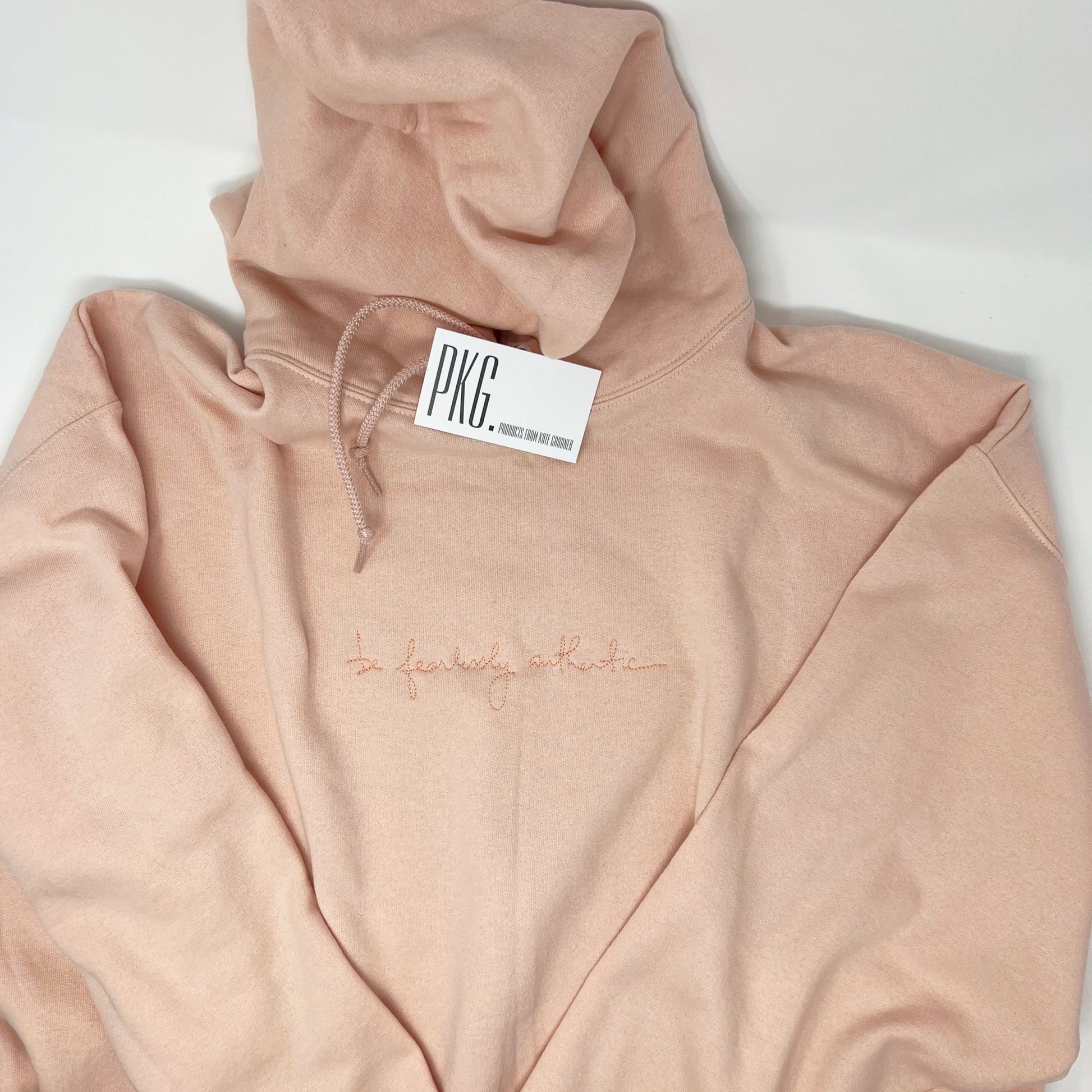 Be Fearlessly Authentic in handwritten script across the front. Blush thread on blush hoodie.