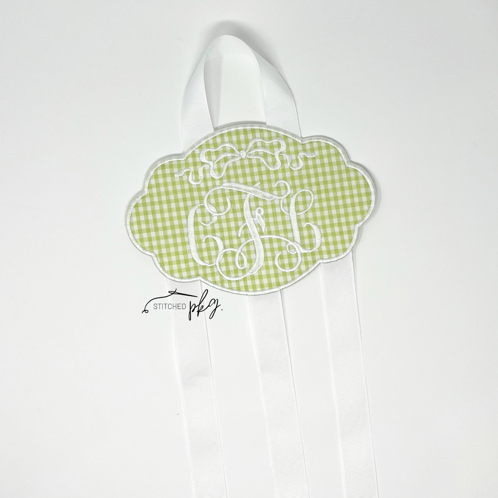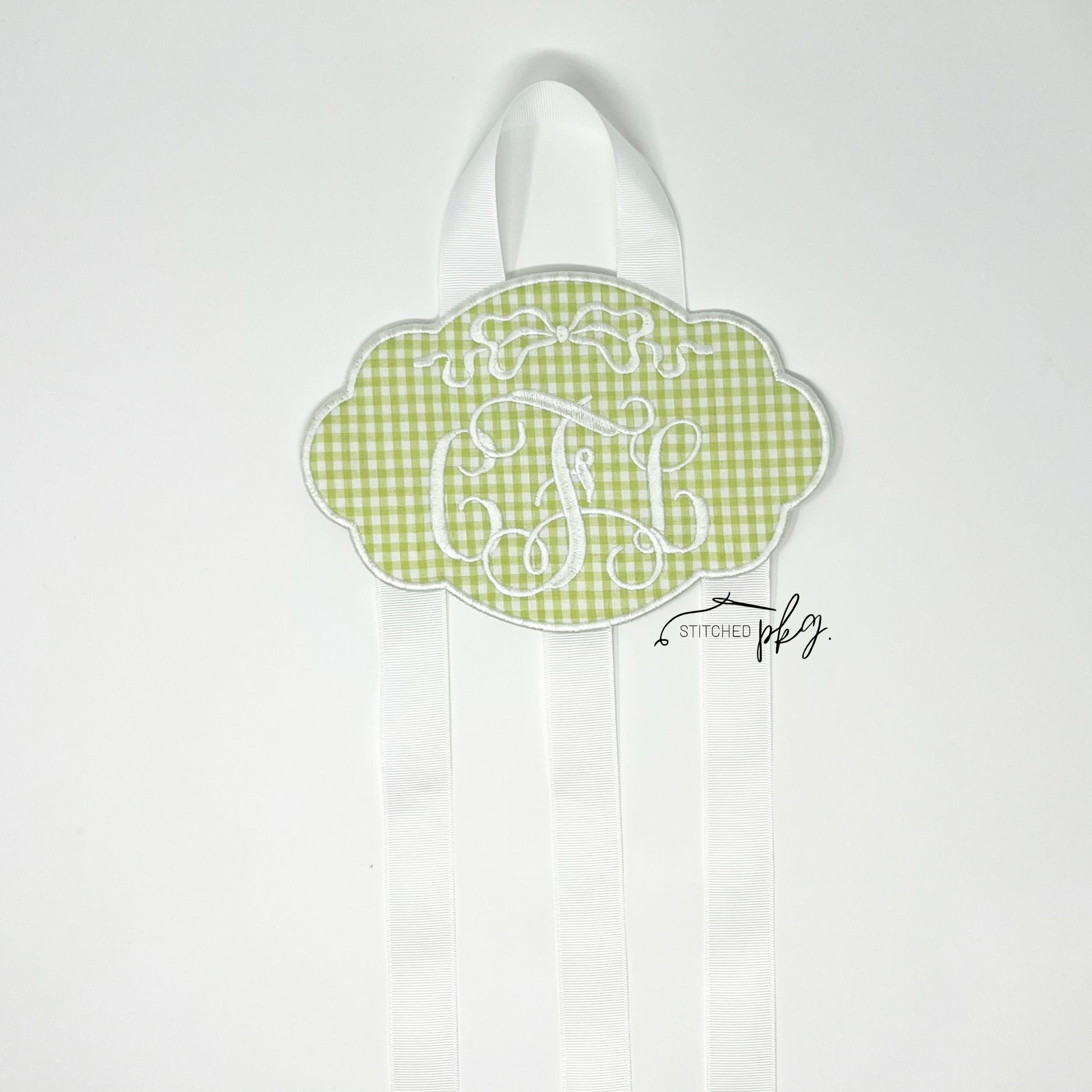 Made with quilt backing in between to add a little more sturdiness. Covered in identical fabric on the back to hide the stitching. Ribbons measure around 22” each and have a loop at the top to hang anywhere.