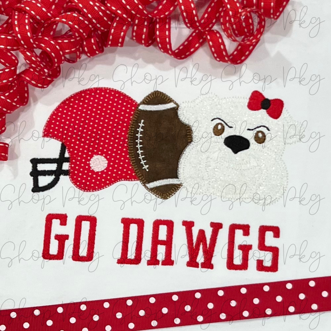 Trio of a helmet, football, bulldog with a bow, personalized with a name.