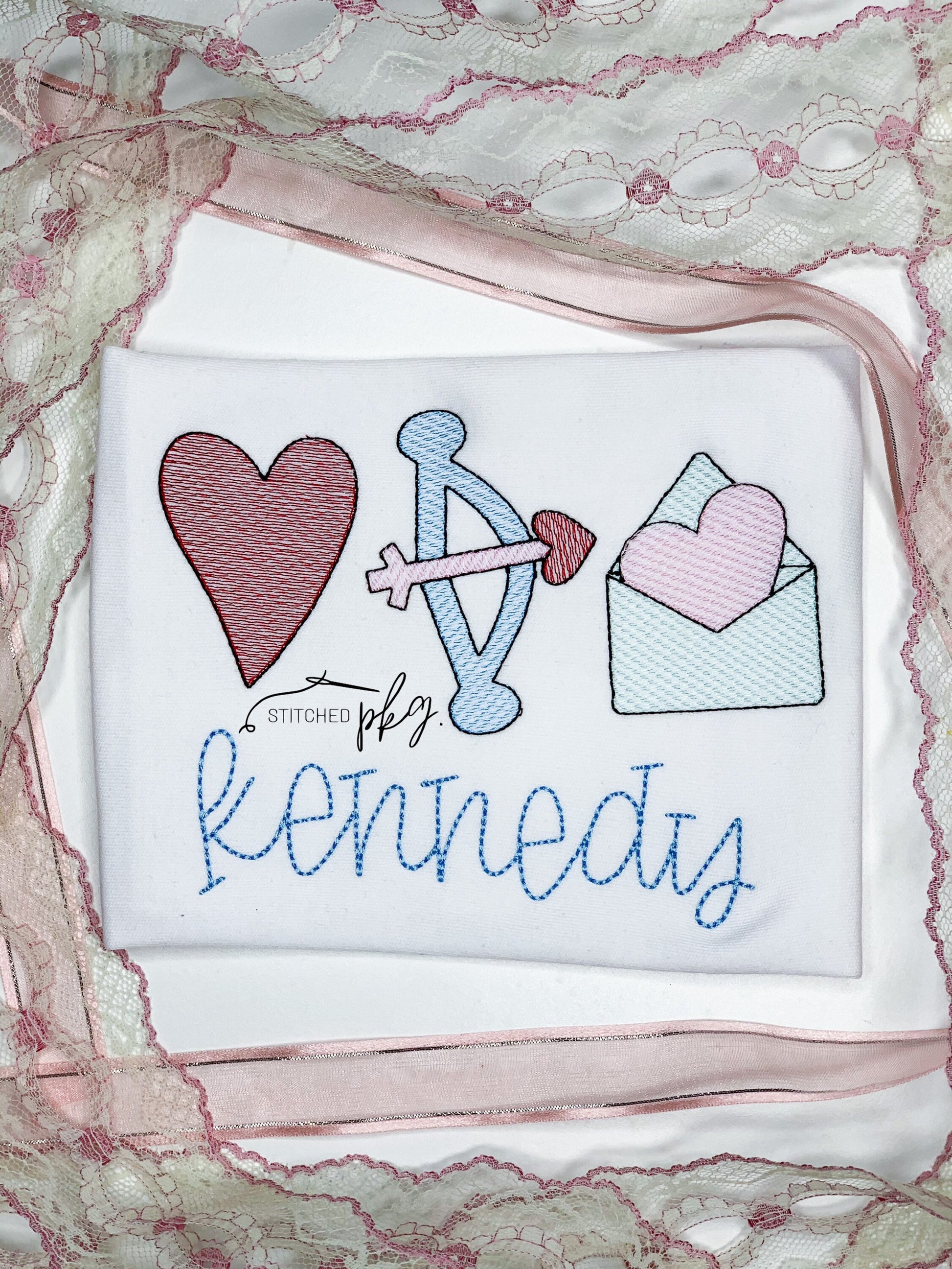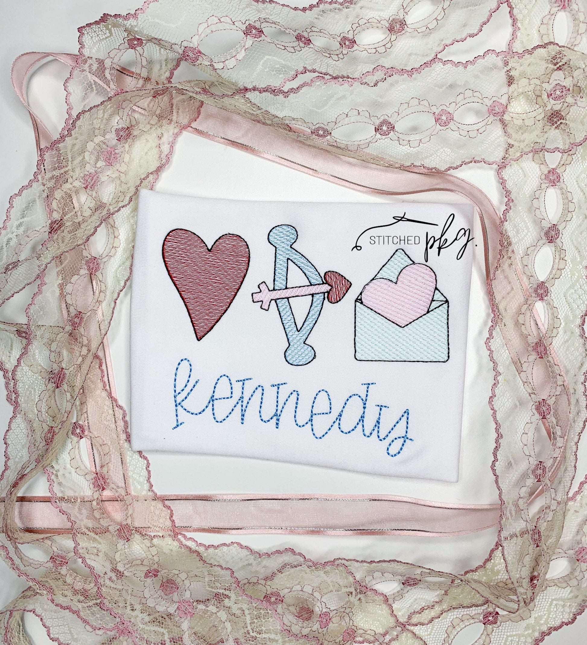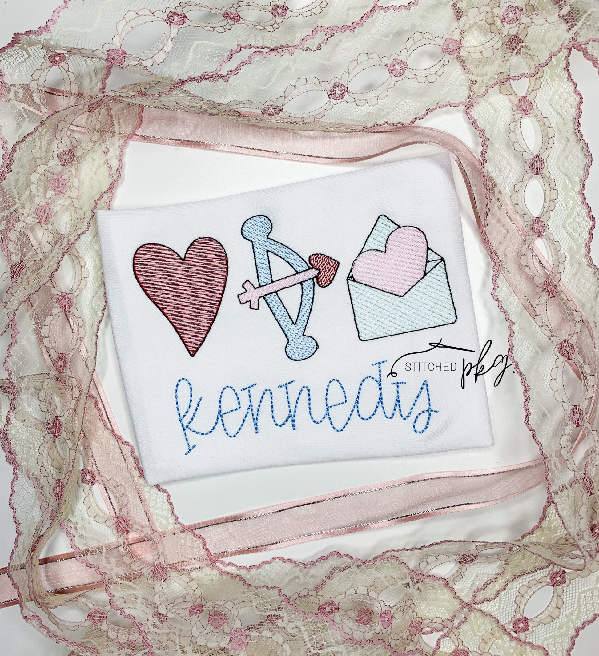 Classic Design of Valentine’s emblems with a sketch fill embroidered design. Then personalized with your little loves name.