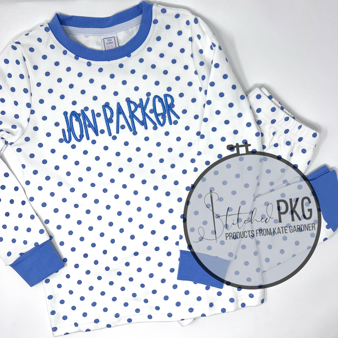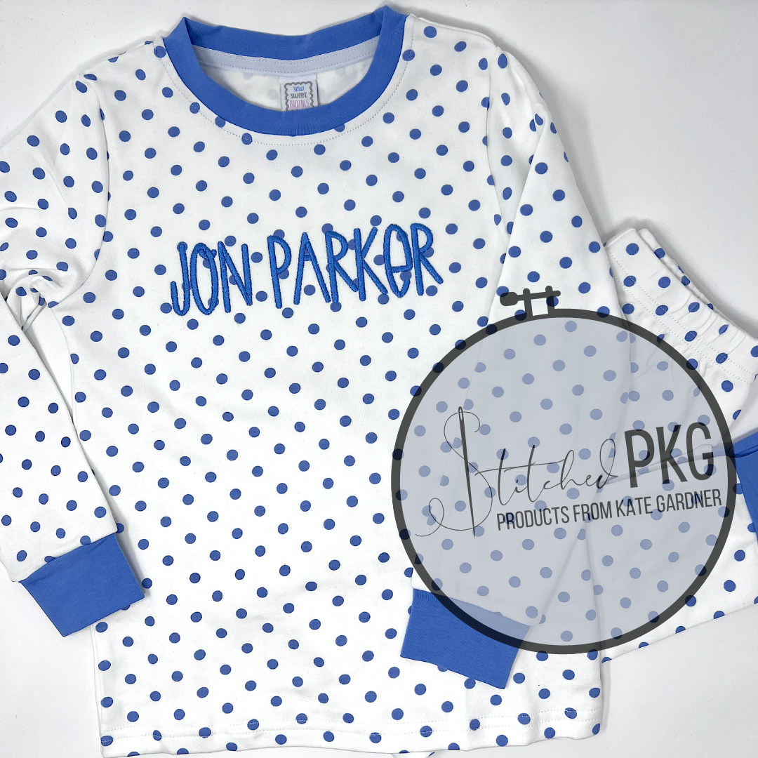 Snug fitting white and blue polka dot pajamas. So cute, and personalized with your little ones name.